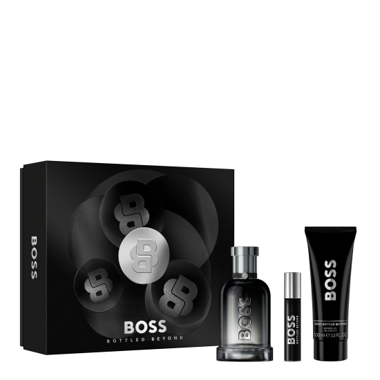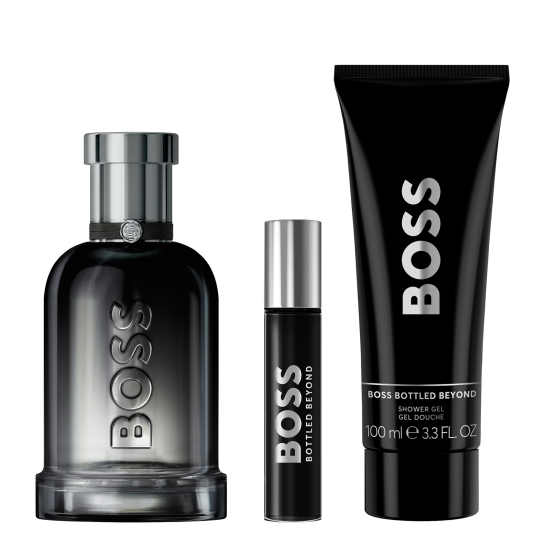 BOSS Bottled Beyond Eau de Parfum za muškarce, 100 ml (3,3 oz), BOSS Bottled Beyond Eau de Parfum putni sprej za muškarce, 10 ml (0,33 oz) i BOSS Bottled Beyond gel za tuširanje za muškarce, 100 ml (3,3 oz).